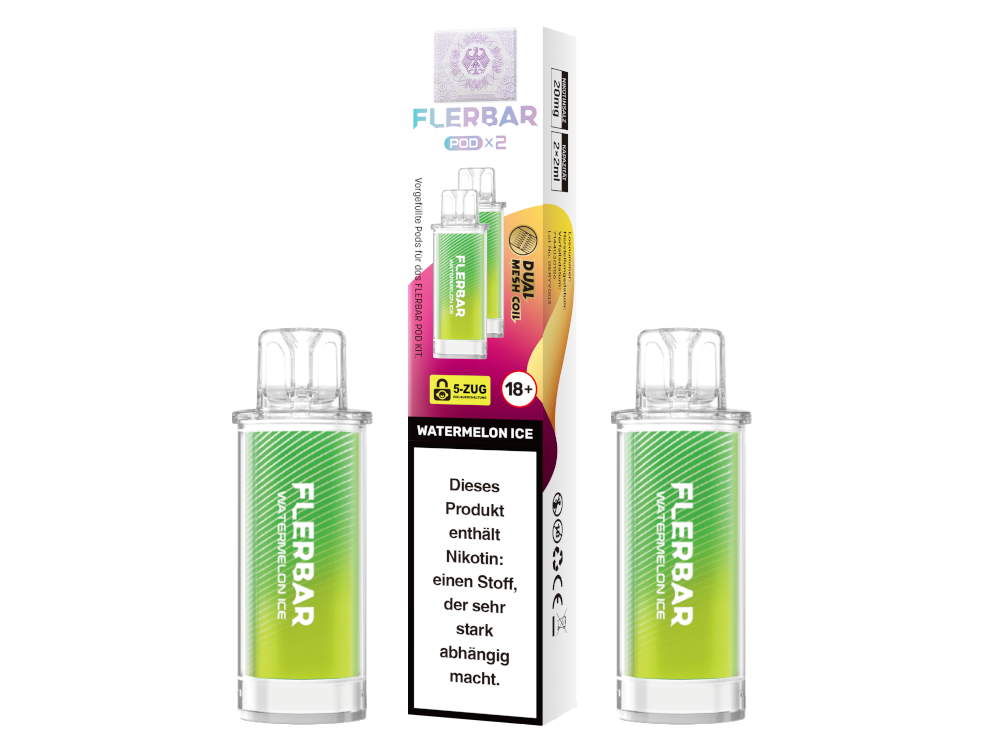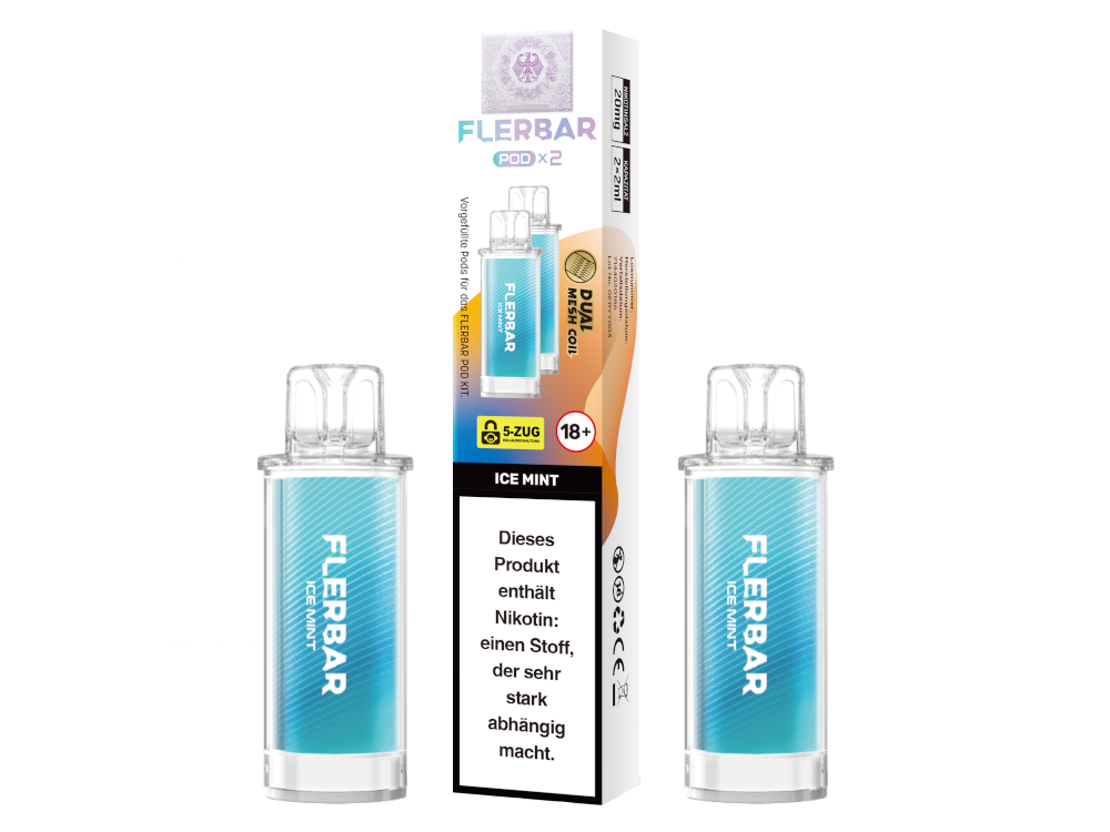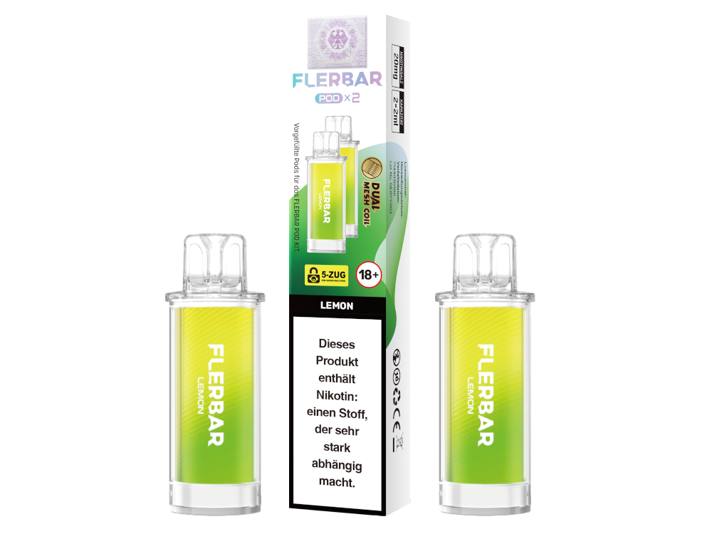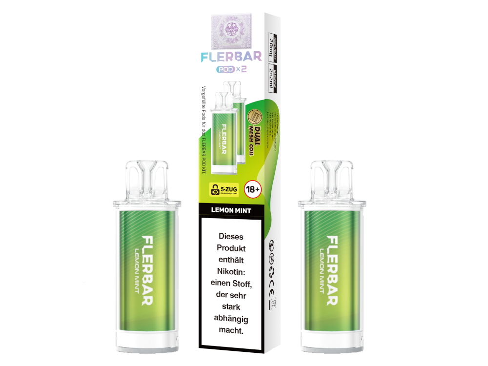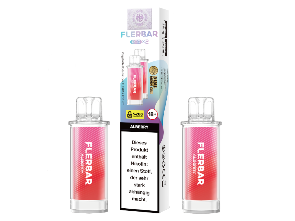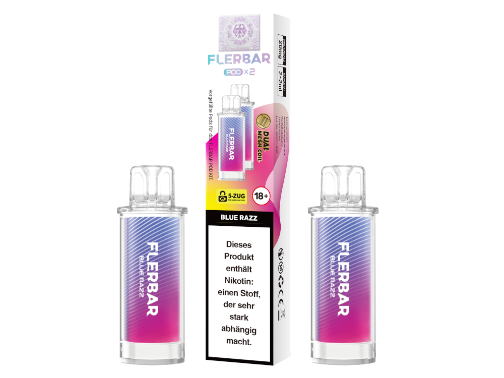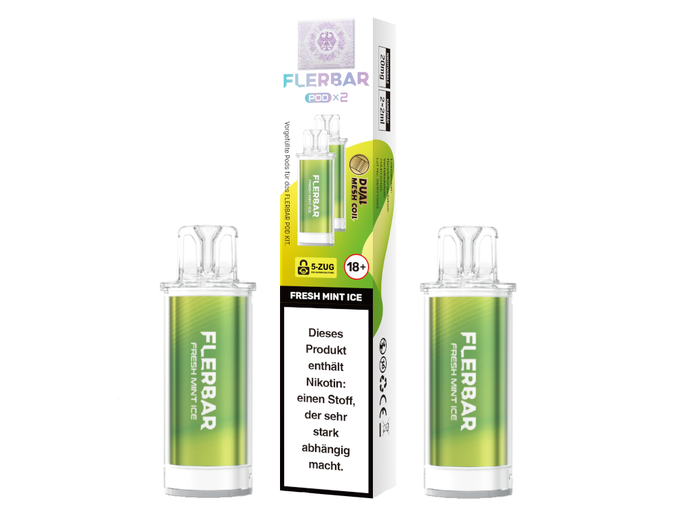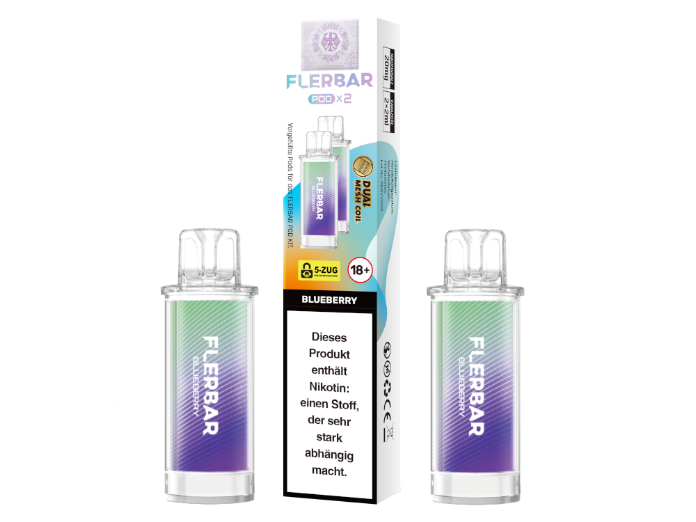 Die Flerbar PODs sind mit dem Flerbar POD Akku kompatibel. Sie erhalten pro bestellter Packung und Sorte jeweils zwei Flerbar PODs. Sie können zwischen 24 verschiedenen Geschmacksrichtungen wählen. Die Pods sind mit einer Gesamtmenge von 2 ml Liquids gefüllt und können nicht nachgefüllt werden, sobald sie leer sind. In den Pods ist ein Dual Mesh Coil fest verbaut, der nicht ausgetauscht werden kann. Bitte tauschen Sie den gesamten Pod aus, wenn dieser leer ist oder Sie eine Veränderung des Liquidgeschmacks feststellen.