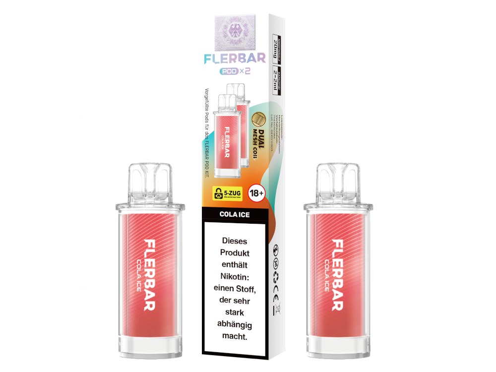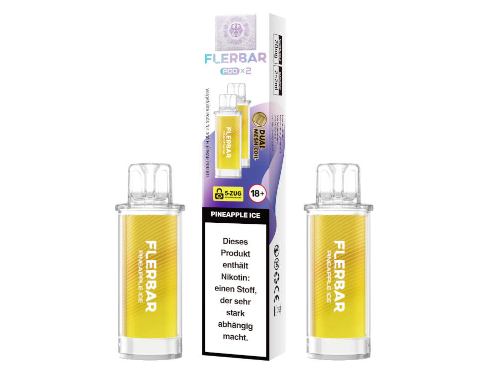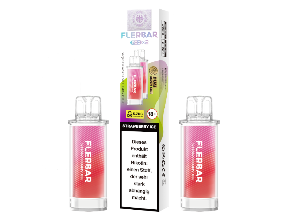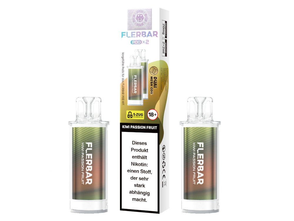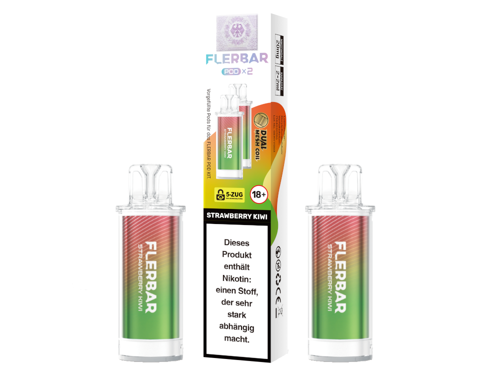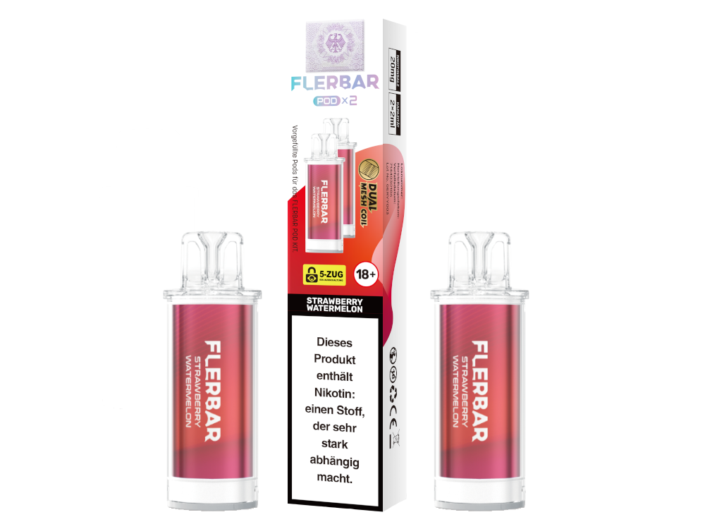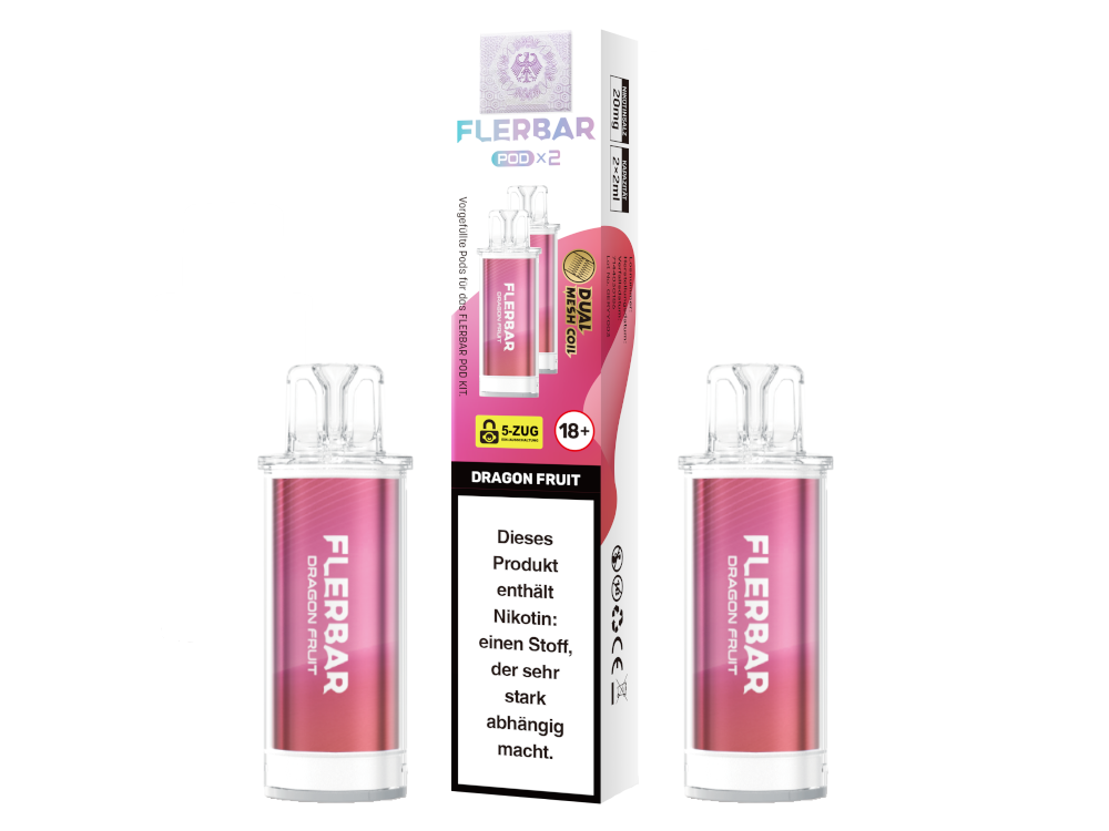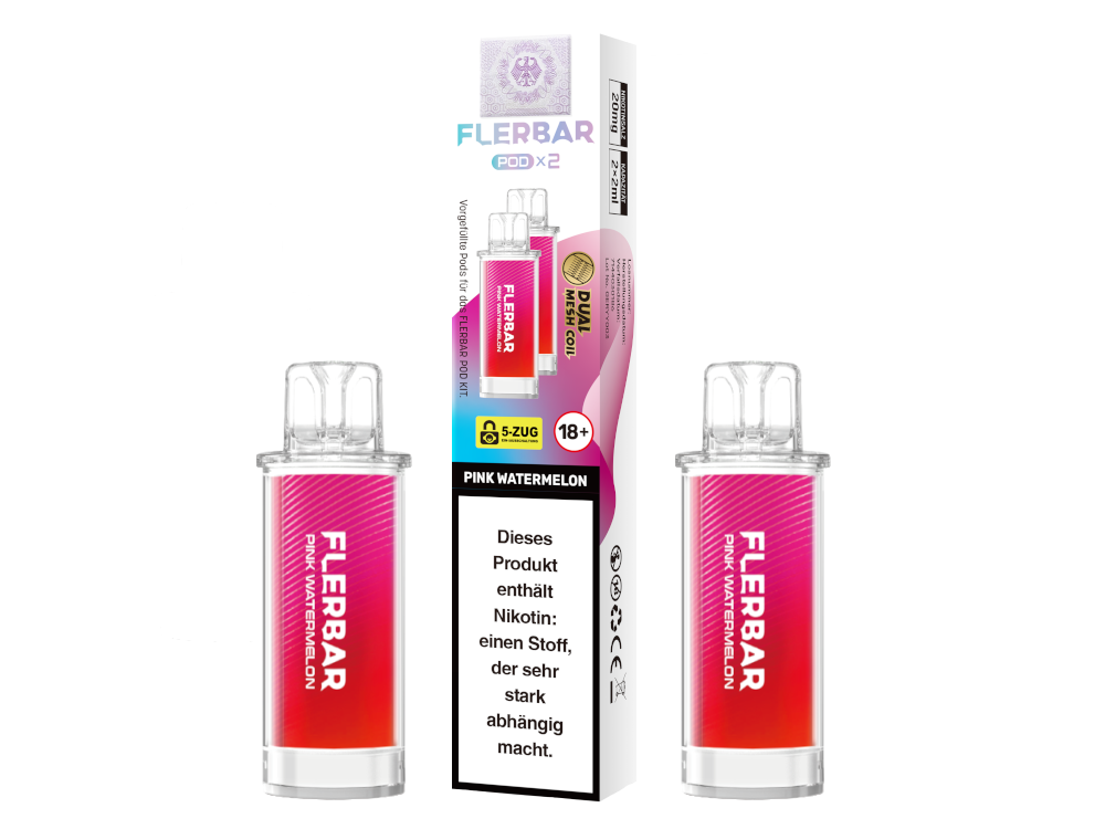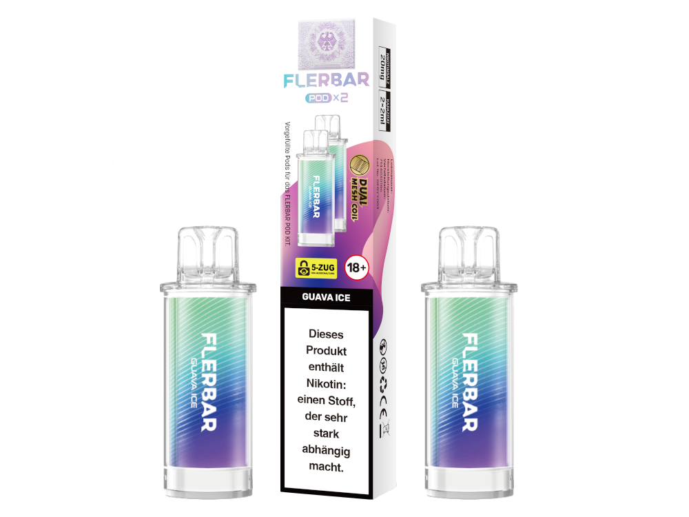 Die Flerbar PODs sind mit dem Flerbar POD Akku kompatibel. Sie erhalten pro bestellter Packung und Sorte jeweils zwei Flerbar PODs. Sie können zwischen 24 verschiedenen Geschmacksrichtungen wählen. Die Pods sind mit einer Gesamtmenge von 2 ml Liquids gefüllt und können nicht nachgefüllt werden, sobald sie leer sind. In den Pods ist ein Dual Mesh Coil fest verbaut, der nicht ausgetauscht werden kann. Bitte tauschen Sie den gesamten Pod aus, wenn dieser leer ist oder Sie eine Veränderung des Liquidgeschmacks feststellen.