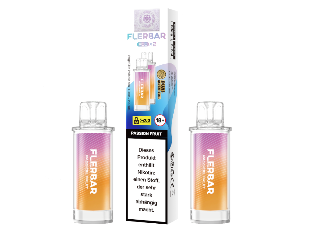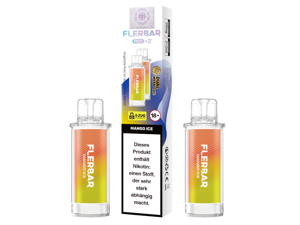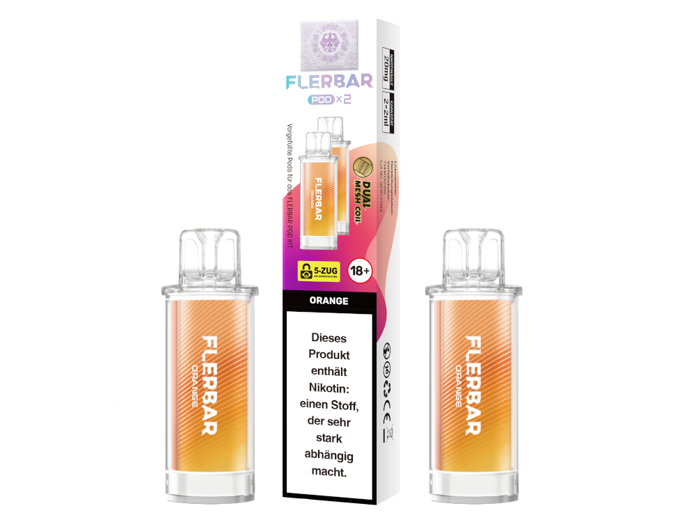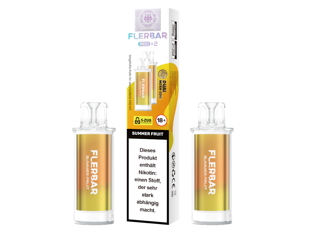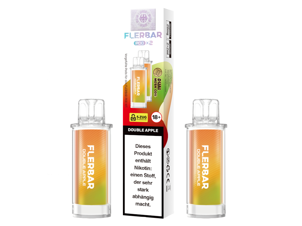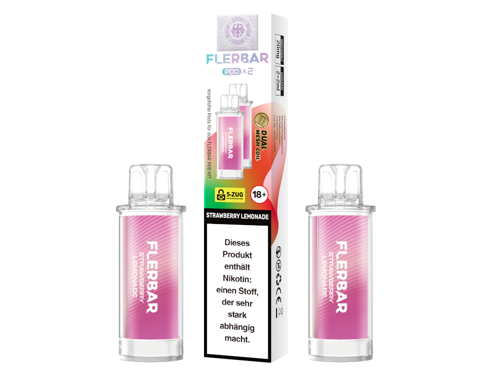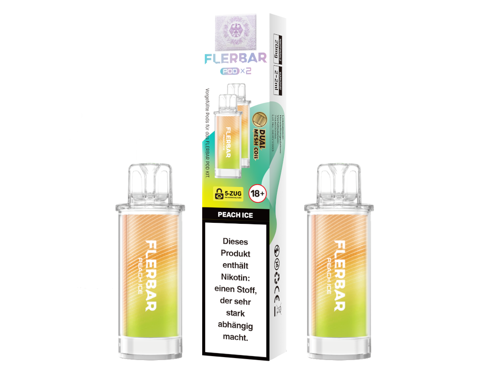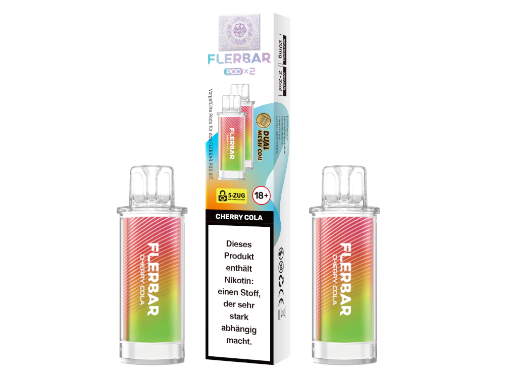 Die Flerbar PODs sind mit dem Flerbar POD Akku kompatibel. Sie erhalten pro bestellter Packung und Sorte jeweils zwei Flerbar PODs. Sie können zwischen 24 verschiedenen Geschmacksrichtungen wählen. Die Pods sind mit einer Gesamtmenge von 2 ml Liquids gefüllt und können nicht nachgefüllt werden, sobald sie leer sind. In den Pods ist ein Dual Mesh Coil fest verbaut, der nicht ausgetauscht werden kann. Bitte tauschen Sie den gesamten Pod aus, wenn dieser leer ist oder Sie eine Veränderung des Liquidgeschmacks feststellen.