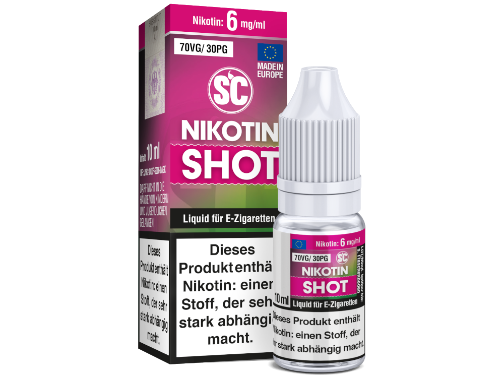 Erhöhen Sie den Nikotingehalt Ihres Liquids mithilfe der SC Nikotin Shots. Die SC Nikotin Shots sind in den zwei Mischungsverhältnissen 50PG/50VG und 70VG/30PG und den Nikotinstärken 3 mg/ml, 6 mg/ml, 9 mg/ml, 12 mg/ml, 18 mg/ml und 20 mg/ml erhältlich.